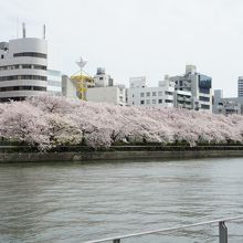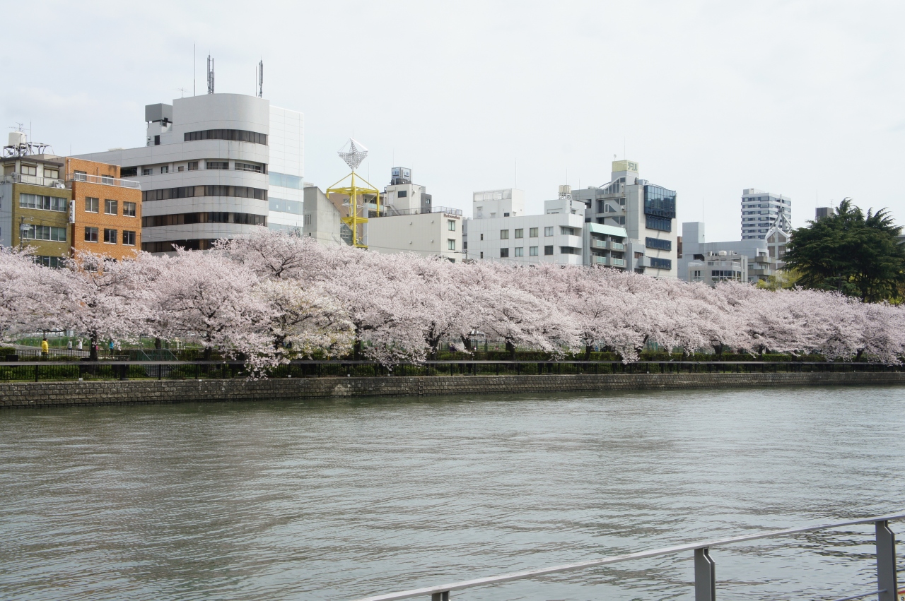 南天満公園は、大川に沿って天満橋から天神橋の間に整備された公園。桜並木がトンネルのようになって続いていて、大阪環状線の列車の中からもよく見えるのですが、今回は、ちゃんと桜の中を歩いてみました。中を歩くのもいいですが、対岸の方から見たり、橋の上から見たり。大阪が水の都であることを実感するような景色を楽しみました。