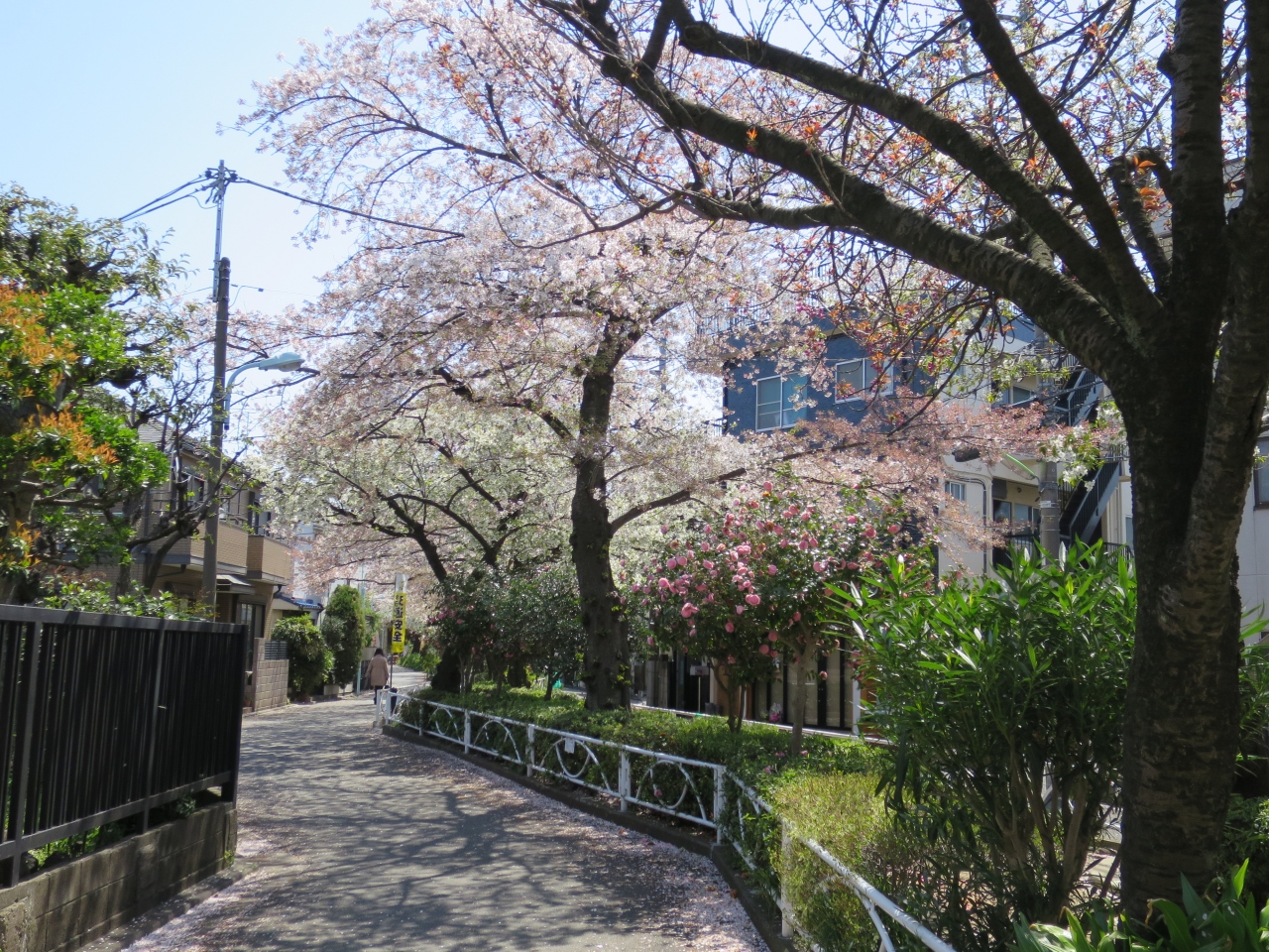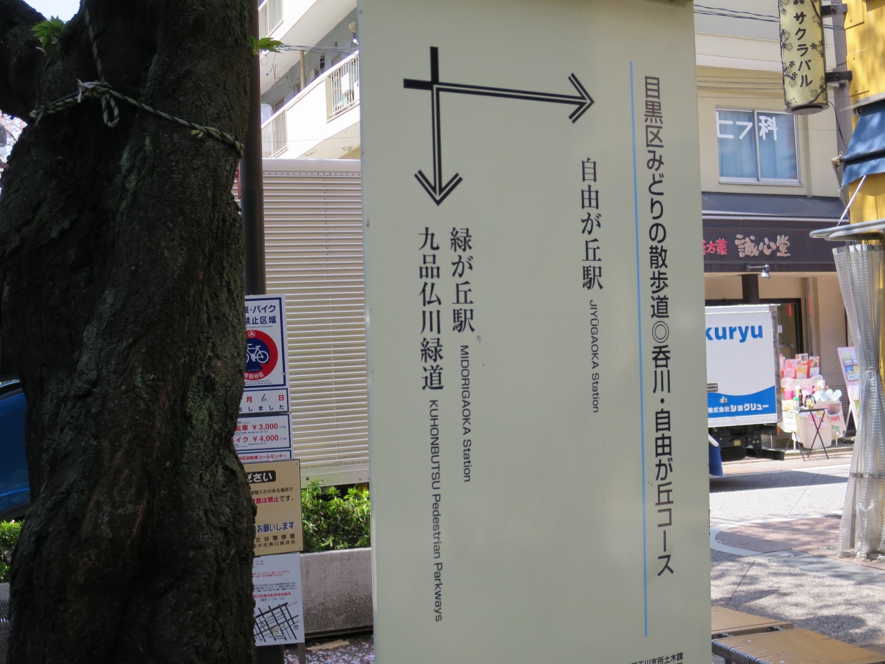 九品仏から始まり緑ヶ丘で呑川に至る九品仏川、暗渠化されていてその上は遊歩道となっており、これが九品仏川緑道です。九品仏から自由が丘までが世田谷区、自由が丘から緑ヶ丘までが目黒区に属しますが、自由が丘駅の南口付近から緑ヶ丘までが育った桜の並木道となっていて、春には目を楽しませてくれます。