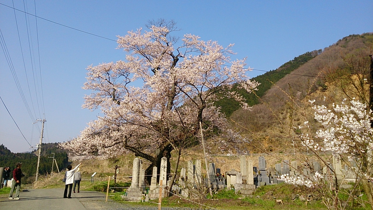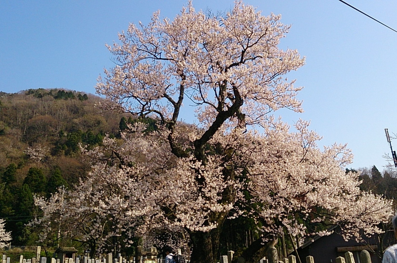 海津といえば海津大崎の桜並木が有名ですが、海津大崎口から海津大崎とは反対方向に500mの街はずれにある墓場にある樹齢300年を越える桜。清水とかいて「しょうず」と読みます。巨木ではないですが古木の割には今も花つきは良く、綺麗に咲いていました。海津大崎に比べるとこちらに来る人はそれほど多くないですが、水上勉の小説「櫻守」でも取り上げられている桜です。マキノ駅から海津大崎口までコミュニティバスがありますが、本数が少ないので電車で来た場合はレンタサイクルがお勧めです。徒歩だと駅から30分ほど。近くに少しですが車を停める場所はあります。