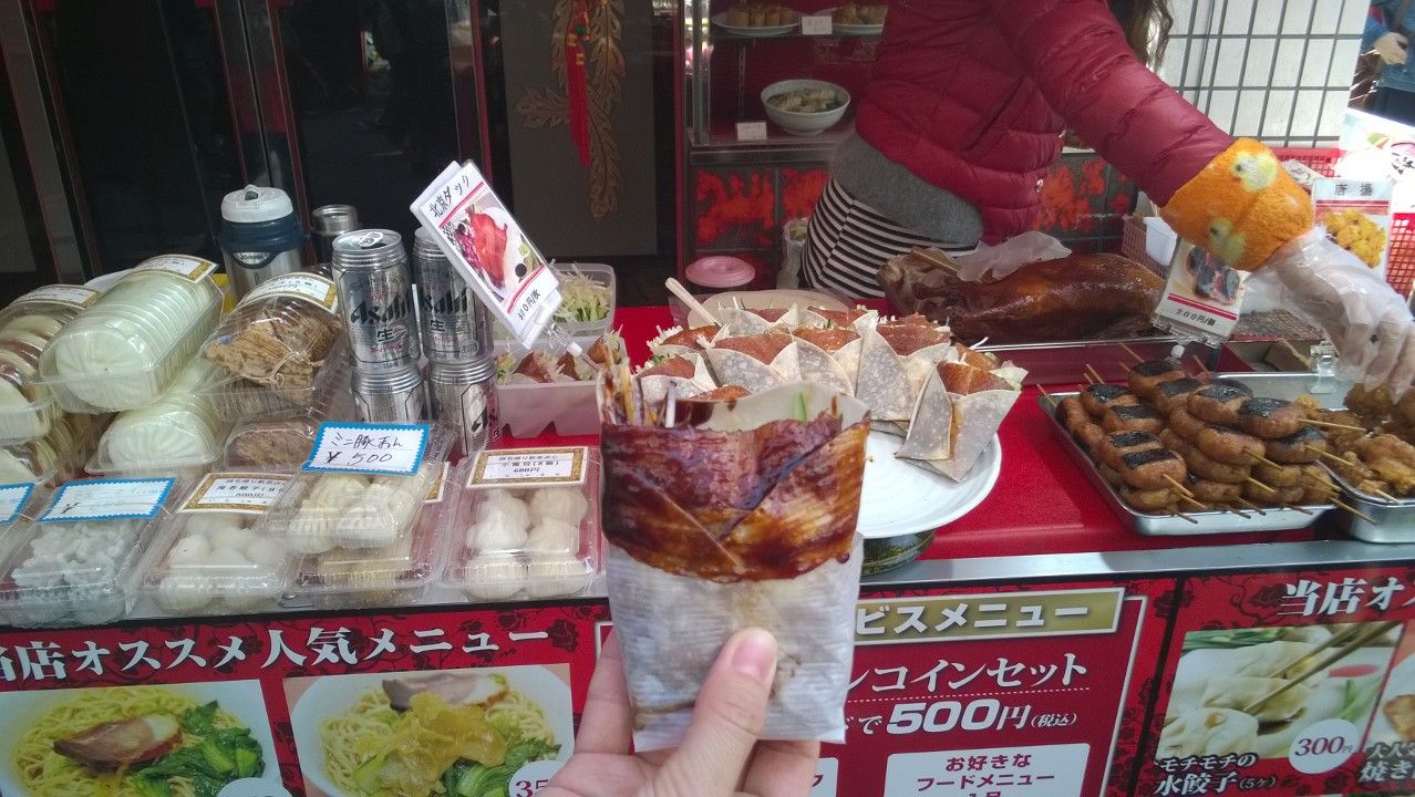 神戸中華街をぶらぶらしているとそこかしこに店頭で点心などを販売しています。北京ダックや豚まんなどが並んでいてどのお店もほぼ同じ内容、同じ値段で売られているためどこのお店の物を買おうか悩んでしまいます。結局他のお客さんがたくさんいるお店とか、店内に持ち込んで食べられるお店などが基準になります。