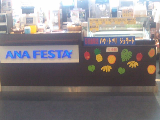 新石垣空港はNH系エアの定期便就航地としては日本最南端かつ日本最西端となりますので、この空港にあるanafestaも日本最南(西)端のショップ、ということになります。制限エリア内にありますので、搭乗者しか利用できないお店ですが、南国のテイストが満載で、他空港のanafestaとはちょっと違った風情が楽しめます。ここで売られているハウ・トゥリジェラートはちょっとした名物になっていますので、是非ご賞味下さい。(因みにハウ・トゥリとは、ハワイ語でお花の名前(何のお花か忘れてしまいました…)を意味しているとのことでした。)
