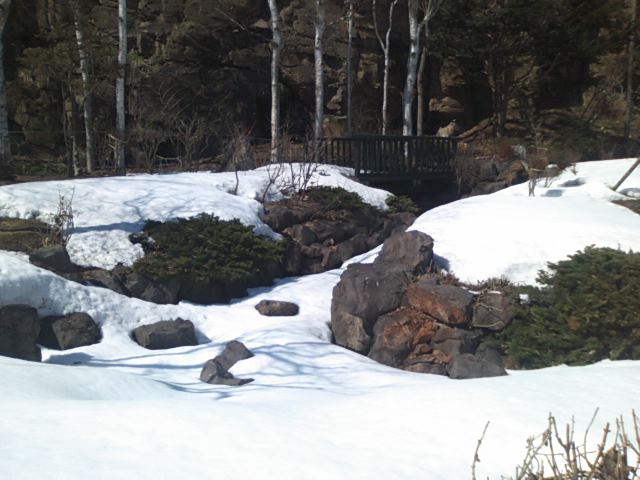こちらの庭園は、ちょっと面白い場所で、シーズンには日本庭園を模した部分の最奥の岩壁から、巨大な滝が流れる風景を楽しむことが出来ます。ただ、意外とシーズンの幕開けは遅くて、私の訪問した四月半ばという時期でも、まだかなりの残雪に覆われて、冬の名残が感じられる風情でした。除雪が行き届いていない場所も多いので、ここのシーズン幕開けはGW頃からと理解しておくと良いかと思います。