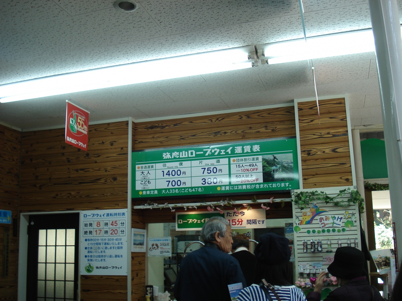 ここに上がるのにロープウェーがある。乗り場は弥彦神社の奥で、歩くと15分近くかかるので、神社に入ってすぐの所にあるシャトルバス利用が楽。