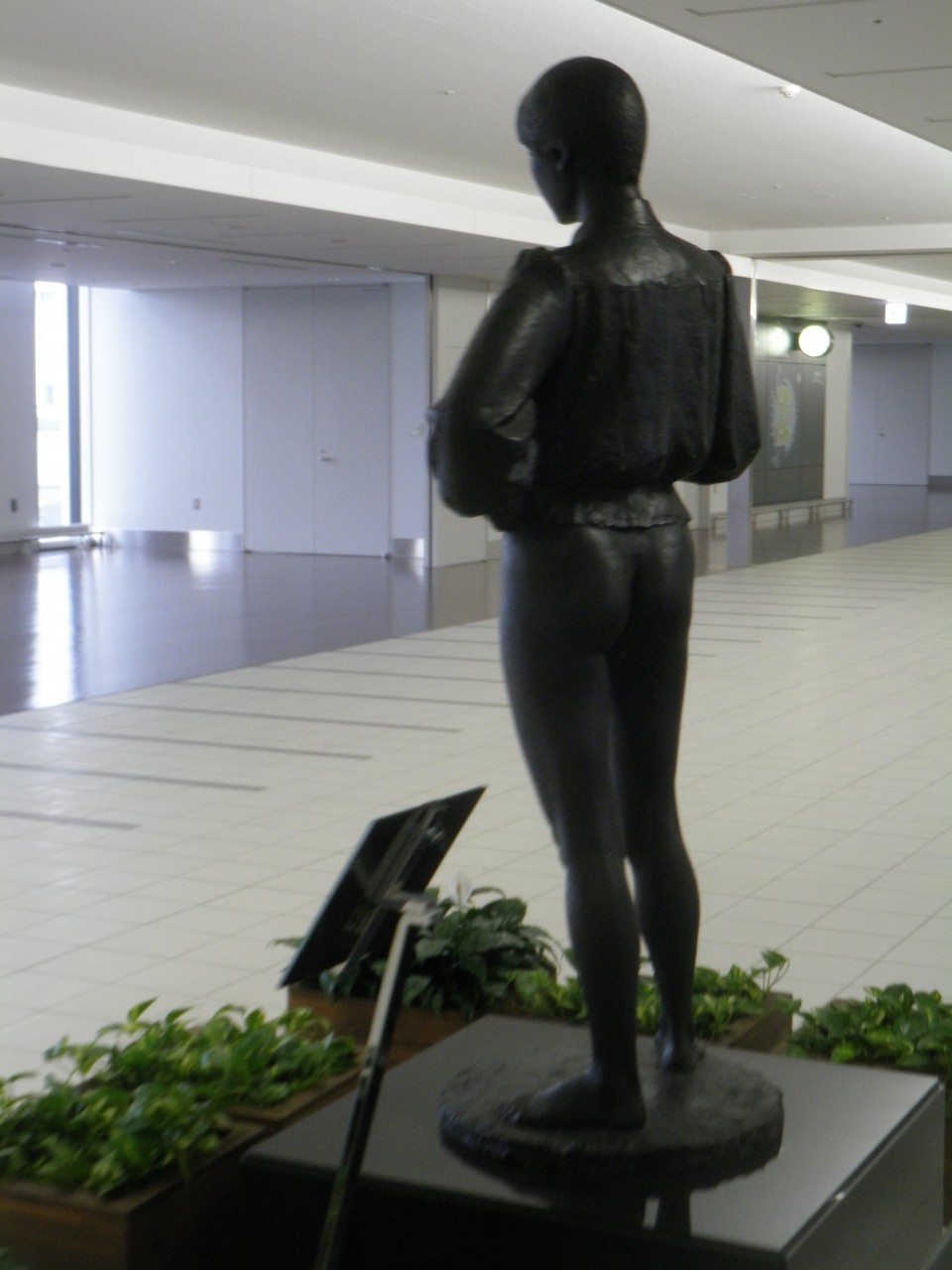 新千歳国際空港で上海行きの便に乗るため、国際ターミナルを利用しました。 出発まで時間があったので、国内線ターミナルまで行く動く歩道を利用しました。 ここの通路は非常に長いせいか、電動カートもあるようです。 動く歩道の両側には、アート作品が何個か展示されているのですが、なぜかあっちを向いているのが多いです。
