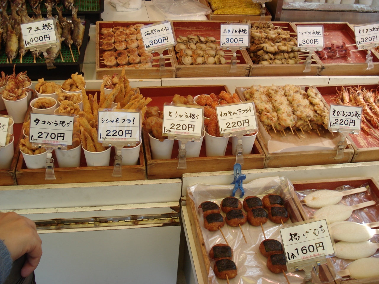 店頭には観光客がすぐにこの場で食べられるようにか、いろいろなものが揚げたり、焼いたりして売られていてどれもとてもおいしそう。同行の者がエビの塩焼きとししゃもの揚げたのを購入。私も少しだけお相伴。おいしかったです。