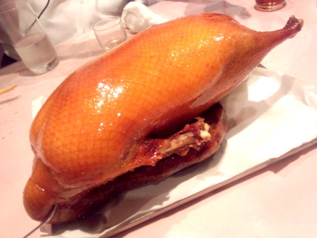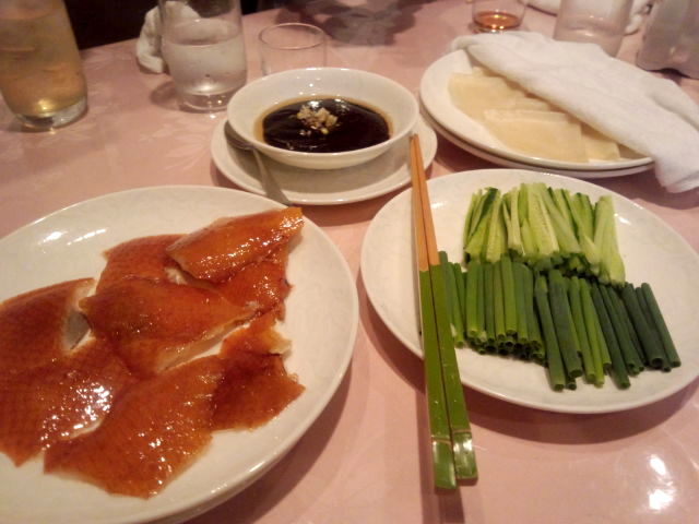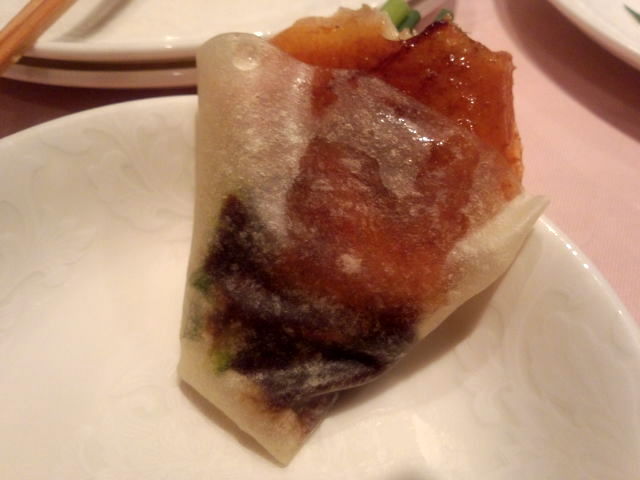 薄餅にダックを1枚乗せ、キュウリ、青ネギを添え、特製の醤をのせて包みます。