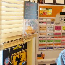 店内に入りとカラフルな椅子が食券販売機の前に並んでおり