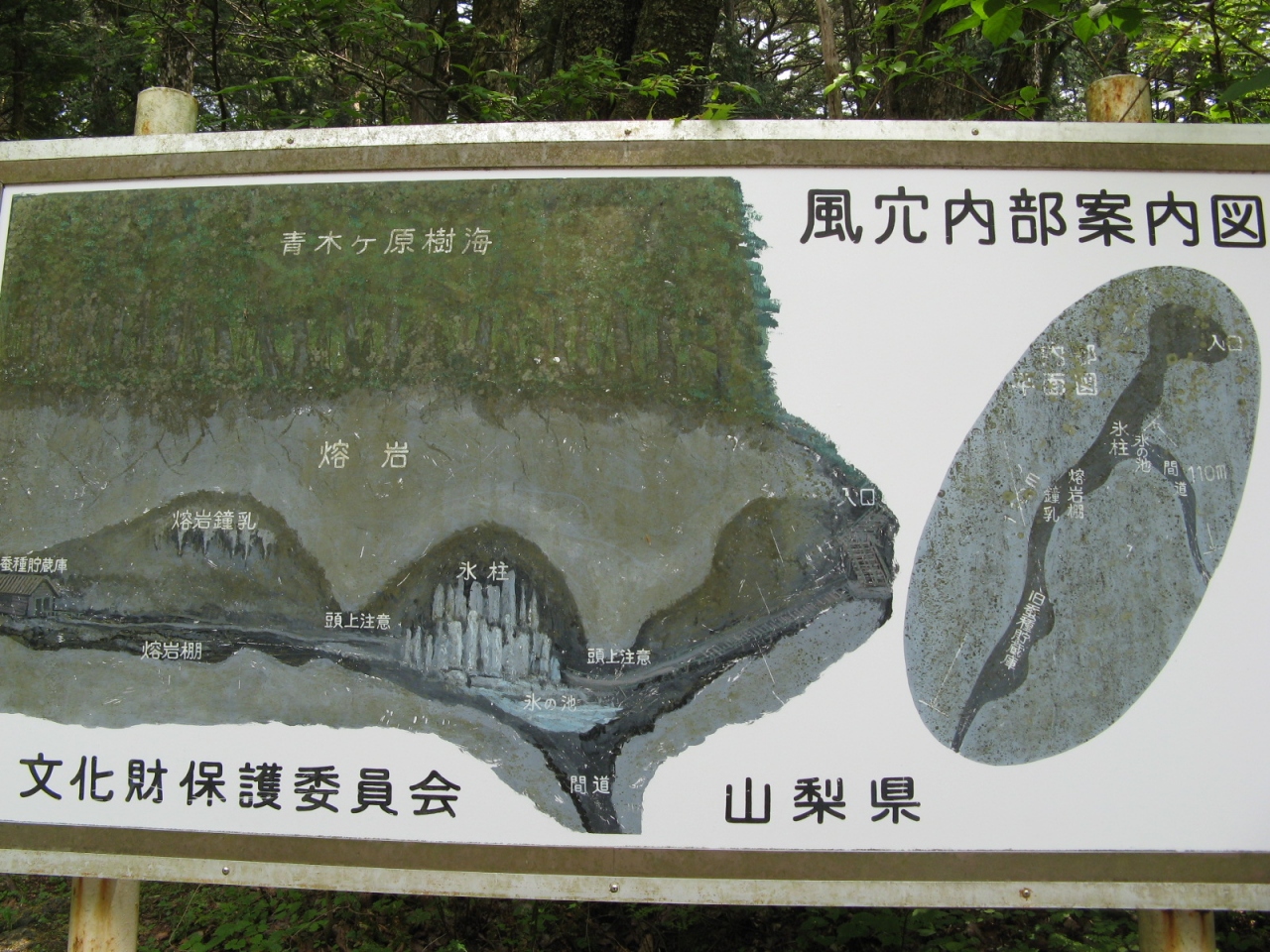 鳴沢氷穴を観た後、立ち寄りました。鳴沢氷穴から車で2分位、青木ヶ原樹海の中にあります。“風穴”と言う名前が付いていますが、鳴沢氷穴とそんなに代わりません。入場料も大人280円と鳴沢氷穴と同じです。全長200mほどの洞窟で、寒くて狭くて暗いし頭を天井にぶつけることもありました。奥のほうには大きな氷柱がありました。通路は足元が悪く、水たまりのあるところもあるので、歩きやすい靴がいいと思います。