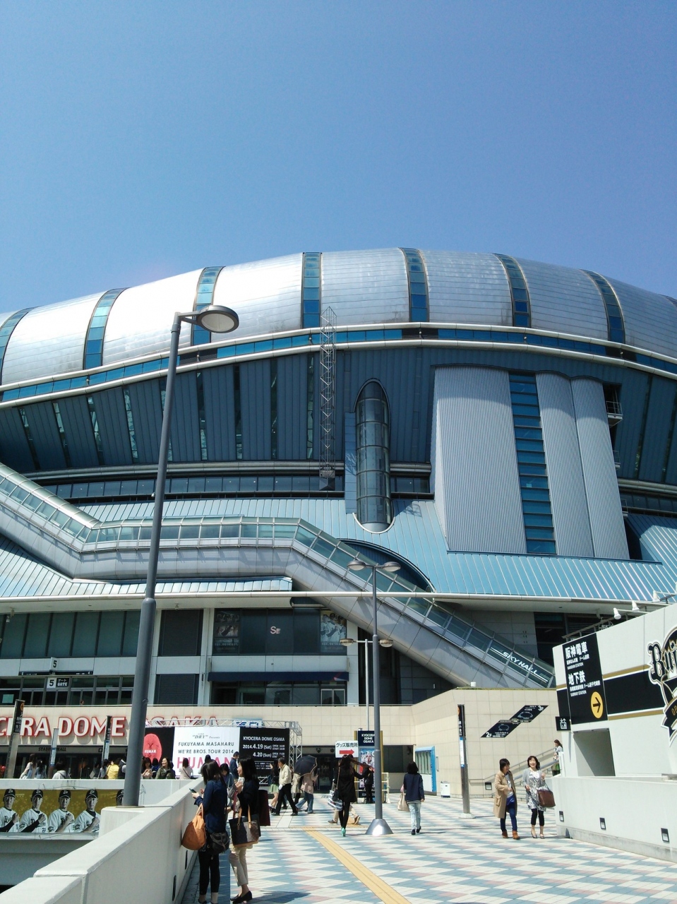 地下鉄の京セラドーム前から、地上出口に出ると目の前です。近未来形の流線型の大きな建物が太陽に反射して、輝いています。