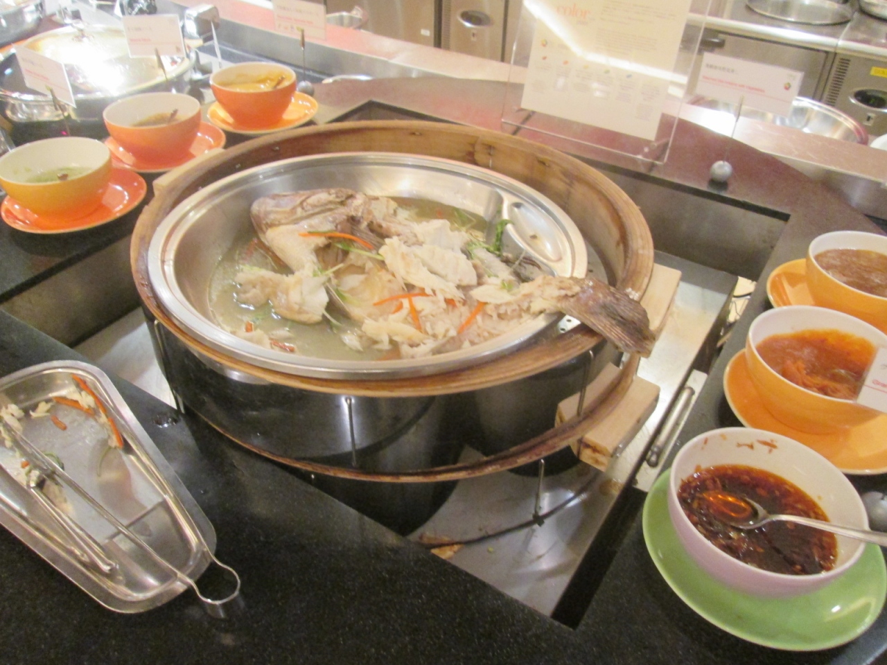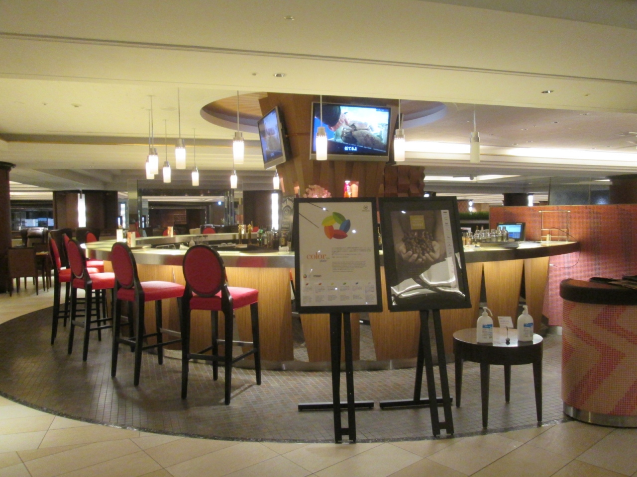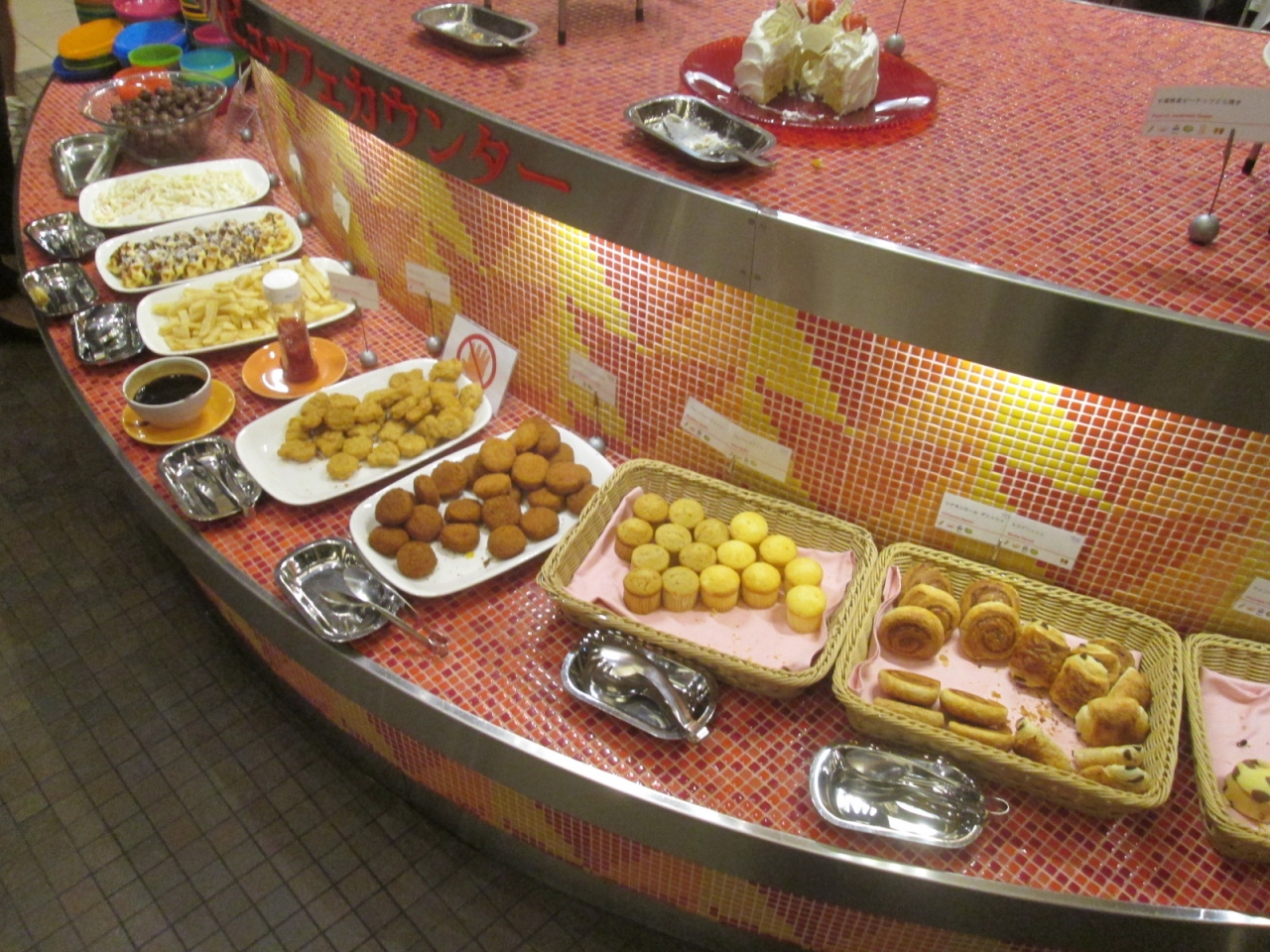「シェラトン・グランデ・トーキョーベイ」の1階にあるオールディ・ビュッフェ・ダイニング「グランカフェ」をディナーで利用しました。店内は子ども連れ家族を意識したポップで明るい雰囲気ですから、大人がゆったり食事を楽しめるといった雰囲気ではありません。「グランカフェ」では恒常的に何らかのフェアを行っていますが、今回のフェアは「8Sheratn Selections Buffet」というもので、国内8つのシェラトンホテルを代表するスペシャルメニューが一堂に…”とタイトルが付けられていました。さて店内には洋食、中華・エスニック、サラダ・和食、スイーツという4つのビュッフェ台に分かれています。洋食のビュッフェ台はライブキッチンになっており、ピザが窯で焼かれているなど臨場感があります。洋食の料理はパスタなど7種類あり、メインのローストビーフは切り分けてもらえます。中華・エスニックのビュッフェ台のメインは真鯛の蒸し物で、タレが6種類あって楽しめました。他にはライスとカレーが2種類ずつに、チャーハンなどもありました。サラダ・和食のビュッフェ台にはラーメン、チラシ寿司などがありましたが、その一角には”野菜しゃぶしゃっぶ”というコーナーがあって興味を惹かれました。スイーツのビュッフェの一角には、”キッズビュッフェカウンター”という子ども用のビュッフェ台も設けられていました。以上4つのビュッフェ台とは離れた場所にはドリンク類のビュッフェ台がありますが、食後のコーヒー・紅茶も含めて飲み物類はすべて別料金になります。「グランカフェ」の特徴としては、ピザ・パスタ・チャーハン・カレーライス・ラーメン・チラシ寿司など炭水化物系が目立つこと、ローストビーフを含めて牛肉料理が3種類あったことなど、やはり子ども連れ家族をメインにした料理構成であることが分かりますので、そそられる料理は多くはありませんでした。ただ、料理の質は以前と比べたら美味しくなったとは思いますし、食材の産地が表示してあるのも楽しい気分になりました。しかし…SPG15%割引は受けられるものの、やはり土日祝日の料金は6000円(平日は5400円)ですし、ビュッフェでありながら食後のコーヒーまで有料というのは…子ども連れ家族向けとも言い難いかもしれません。