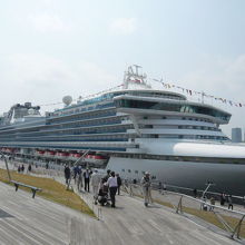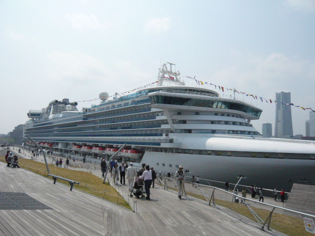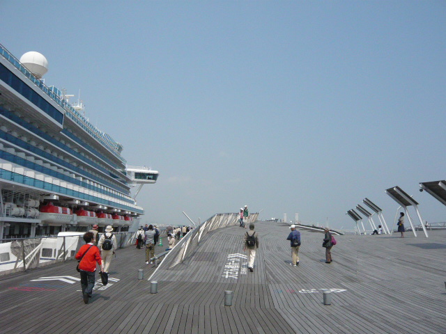 木のデッキが波を打ったような不思議な造りで楽しませてくれました。眺めはどの方角を見てもビューポイントです。晴れの日はみなとみらい方面は一日中、青空と一緒に写真が取れます。ベイブリッジは午後。山下公園、マリンタワー方面は逆に、山下公園から大さん橋を見るときれいに見えます。大桟橋の見どころは下から上って行くときの角度がたまりません。デッキをぐるりと歩いて回るだけでも最高の観光気分に浸ります。この日はダイヤモンドプリンセス号が停泊中でした。