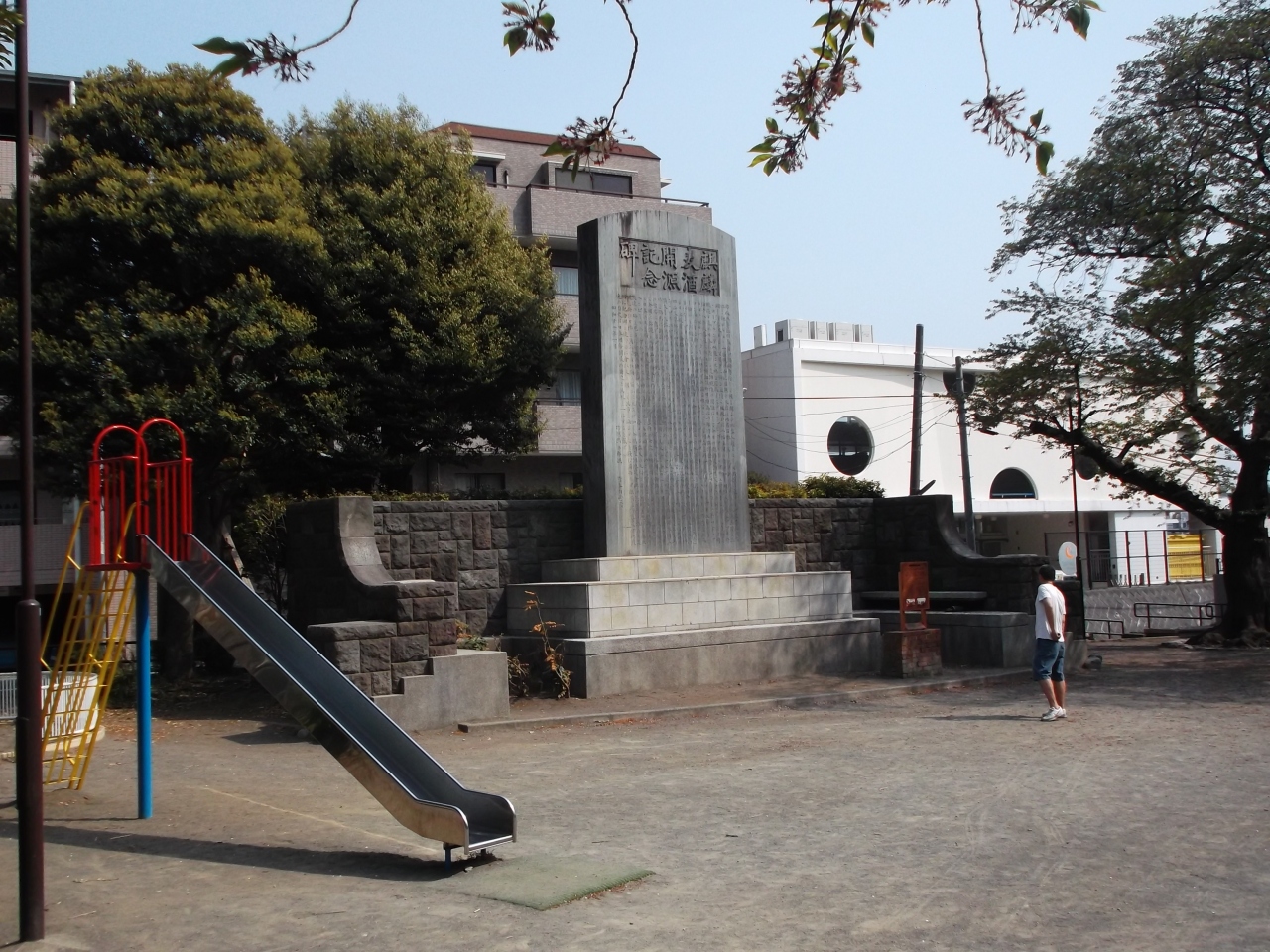 遊具のある普通の児童公園とも言えますが、大きな碑が目立ちます。これが「麒麟麦酒開源記念碑」です。また、他方の一角には「日本最初の麦酒工場」碑も建っています。
