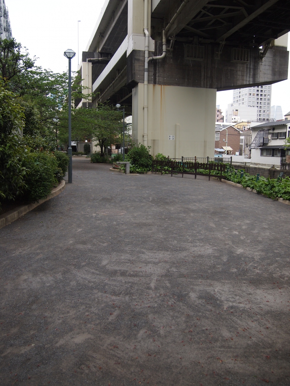 上を首都高速道路の高架が走っていて、隣は雑居ビル。あまり開放的とはいえない空間のせいか遊んでいる児童などもなく、ひっそりと人気のない静かな公園でした。