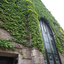 大谷石とステンドグラス、そして壁を這う緑のつたが雰囲気のある古い教会です。