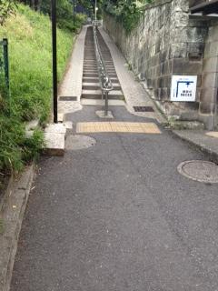 真ん中に手すりがあり、中央部分が階段、両端は自転車用にスロープになっている。