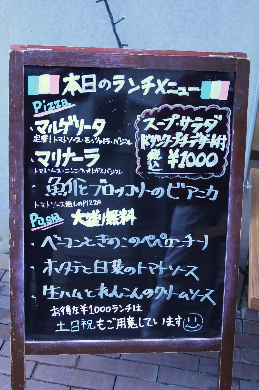 土曜日曜日もランチOK。ランチは、メインのお料理(6種類のパスタ・ピザ中から選ぶ)の他にスープ・サラダ・飲み物・プチデザート付きで1000円也。しかもリーズナブルなだけでなく、美味しい。このお値段でこの美味しさのランチに、行列が出来るのも納得です。