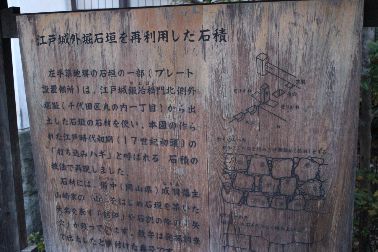 掲示板によると、石垣の一部は江戸城鍛冶橋門北側外濠跡から出土した石垣の石材を再利用して作られています。