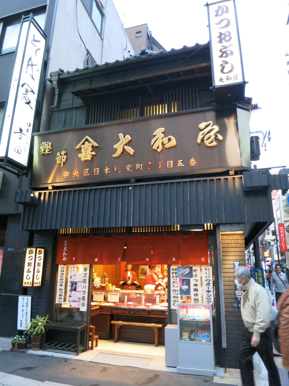 日本橋には江戸時代に魚河岸があったことから、にんべんを始め鰹節を扱う店が何軒かある。中央通りに面した鰹節専門店 大和屋もその一つです。鰹節、削り節等様々な形態の鰹節が売られています。この店は営業時間が短いので注意が必要。月~土10:00~18:00で日、祝祭日は定休日です。