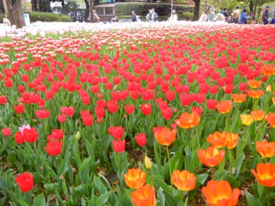 様々な種類のチューリップが植えられ、色の配置が考えられているところもあって