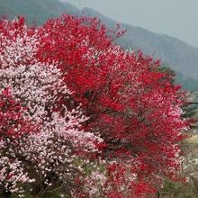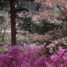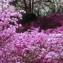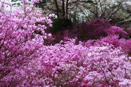 駐車場の周辺には紅白のモモの花が咲き、そこから5~600メートルばかり登ったところに紫のミツバツツジが群生する。