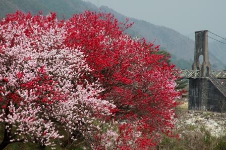 岐阜県中津川から長野県に少し入ったところ(JR南木曽)にミツバツツジが見事に咲き乱れる「天白公園」がある。JR南木曽駅を降りて10分ばかり歩くと木曽川の対面にあり、橋を渡ったところに駐車場もある。