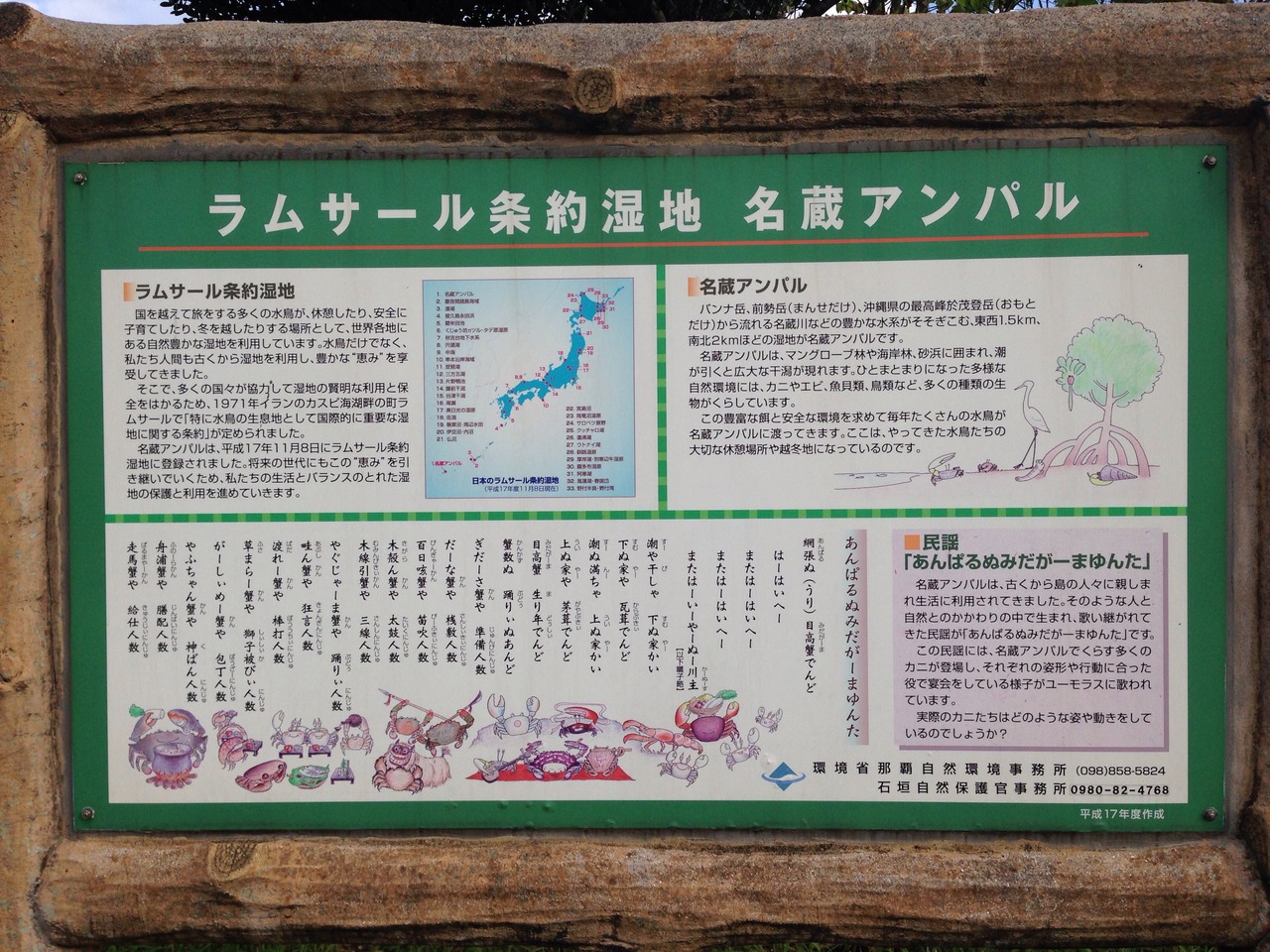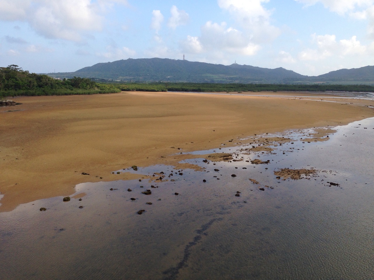 名蔵大橋の両側に車を止めることが出来ますが、河口に降りる道は、登る時は、砂でタイヤが滑り、車は危険ですので、やいま村を越えて直ぐ、名蔵大橋の手前の駐車場をお勧め致します。