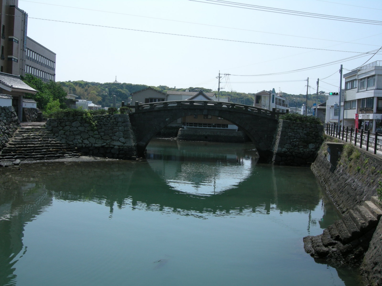 佐世保からバスで平戸観光へ行きました。バス停から徒歩で3分くらいお城方面に歩くと、鏡川に石橋がかかっています。これがお城と城下町をつなぐ幸橋です。かつて平戸にあったオランダ商館の石造建築に携わった石工から伝授されてきた技法が用いられたと言われることから「オランダ橋」の別称が生まれたそうです。平戸観光スタートの目印といったところでしょうか。