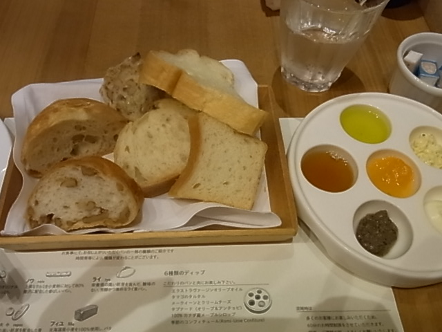 初めに食事パン6種とディップ6種がすぐに出てきました。