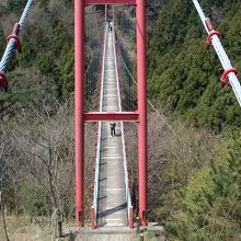 展望台と良寛様が過ごした「五合庵」をこの吊り橋はつないでいます。吊り橋の柵の部分が朱なので、山のみどりと相まってとても絵になる橋です。