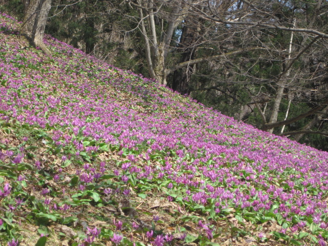 仙北市西木町の栗林に群生しています。カタクリは花をつけるまで6~7年かかるとのこと。地元のガイドの人が教えてくれました。訪問したのは4月20日。もう数日で満開とのことでしたが、早咲きの場所と遅咲きの場所があるので、期間中時期をのがすことはなさそうです。