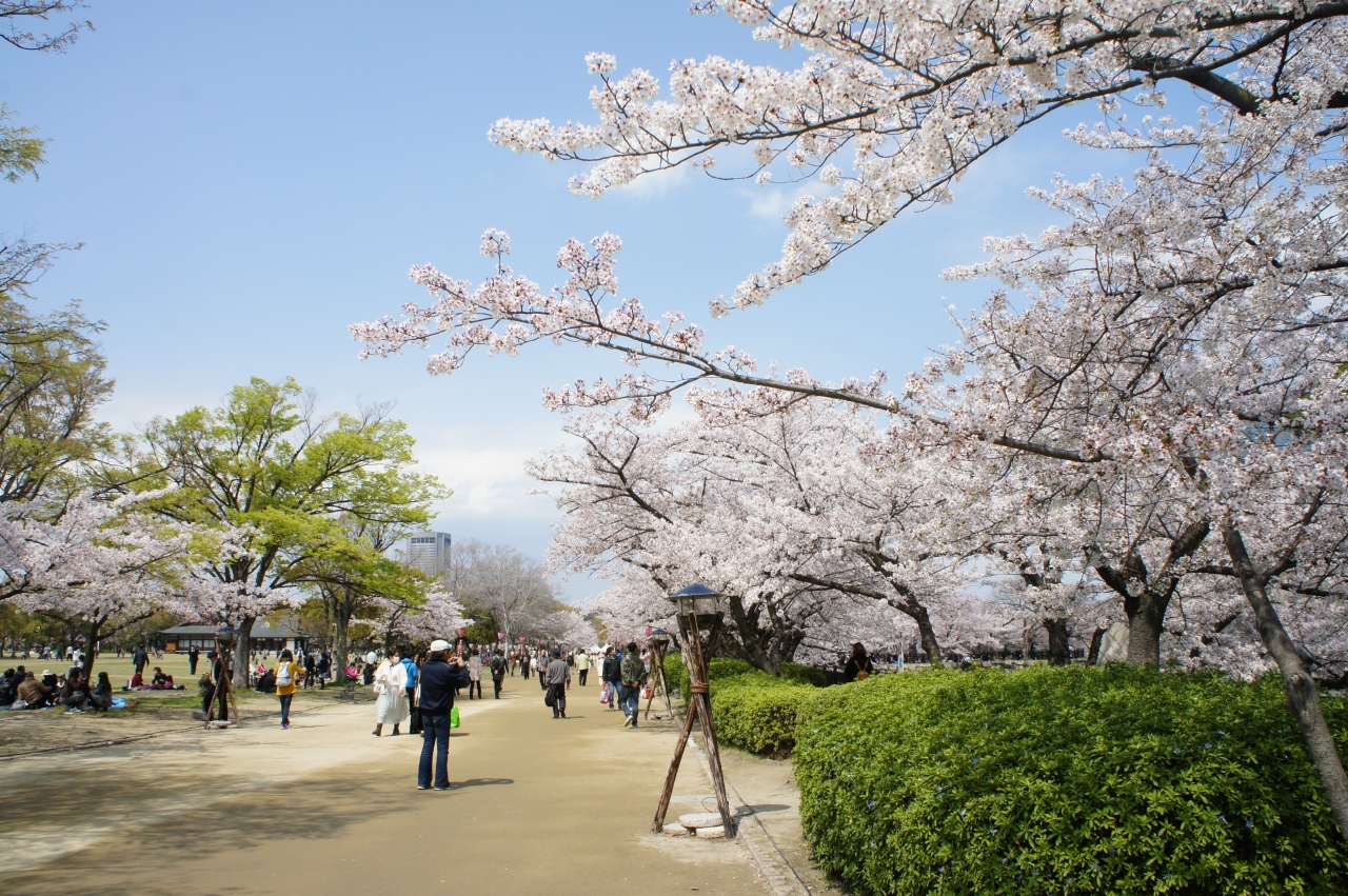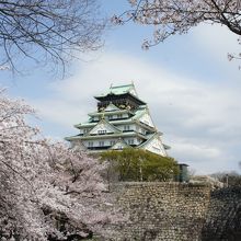 西の丸庭園は、600本のソメイヨシノが植えられ、大阪城公園の中でも一番、桜の花が濃いエリア。200円の入場料を払って入りましたが、桜の季節なら、ここに入らない手はありません。芝生の広場も気持ちいし、正面には絶景の天守閣。お花見のグループが大勢詰めかけていましたが、皆さん、気分は最高潮だったでしょう。