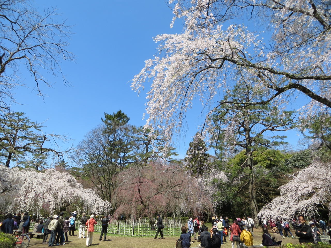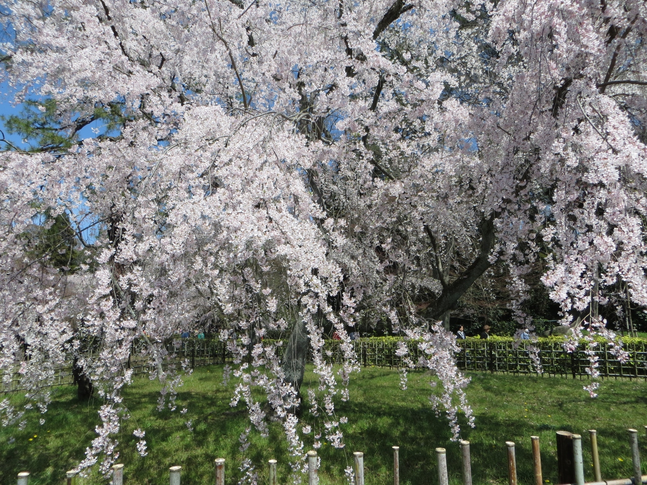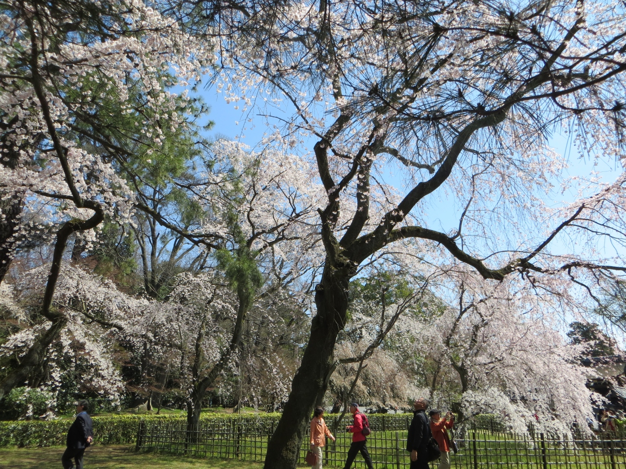 京都府庁、護王神社から京都御苑へ入りました。お目当ては近衞邸跡の枝垂れ桜。桜の名所です。広い御苑の北西・今出川通に近いところにあり少々遠いのでこれまで来たことがありませんでした。訪れてびっくり。枝垂れ桜が見事でした。遠くても訪れる価値アリです。