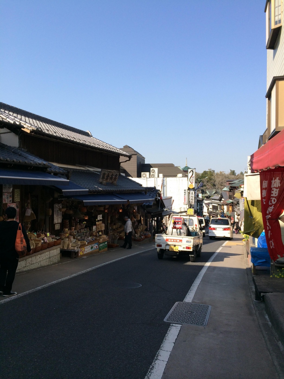 道は狭くて車は一方通行。新勝寺に近づくにつれて道幅は狭くなり、歩道も確保されていない所もありました。(段差はなく色で区別されていた)