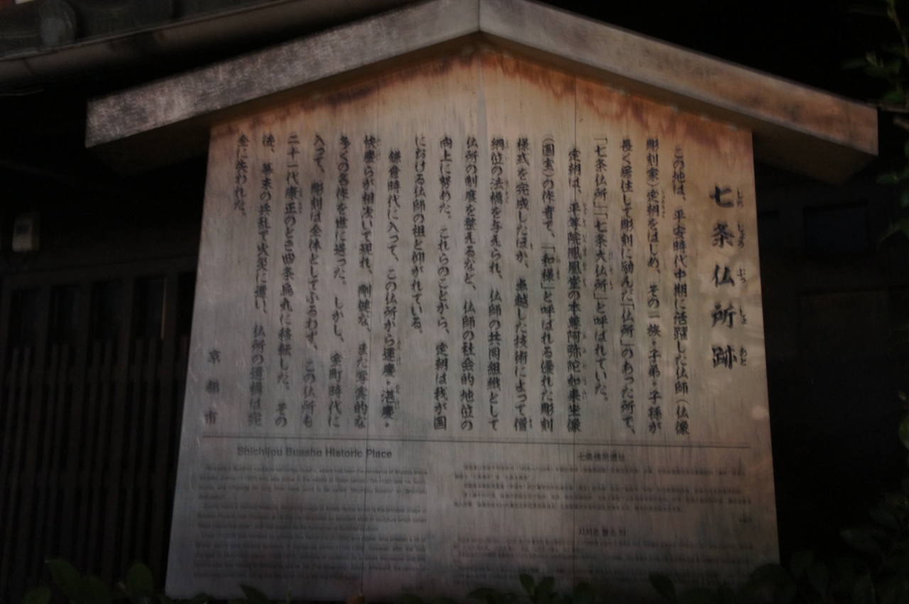 七条仏所跡は、七条大橋から七条通を西へ進んだところ。駒札があって、平安時代中期に仏師の定朝をはじめ、その一族、子弟、子孫が長く居住し、彫刻に励んだ場所とのこと。また、鎌倉時代に入ると、運慶、湛慶、快慶らも相次いで現れたとしています。