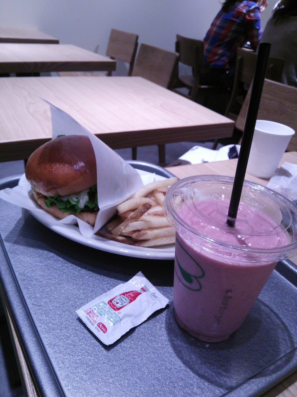 今回は「アボガドわさびバーガー\562」と「スムージー&フライドポテト\648」とチョイス。スムージーは種類が選べるので、季節限定の苺にしました。
