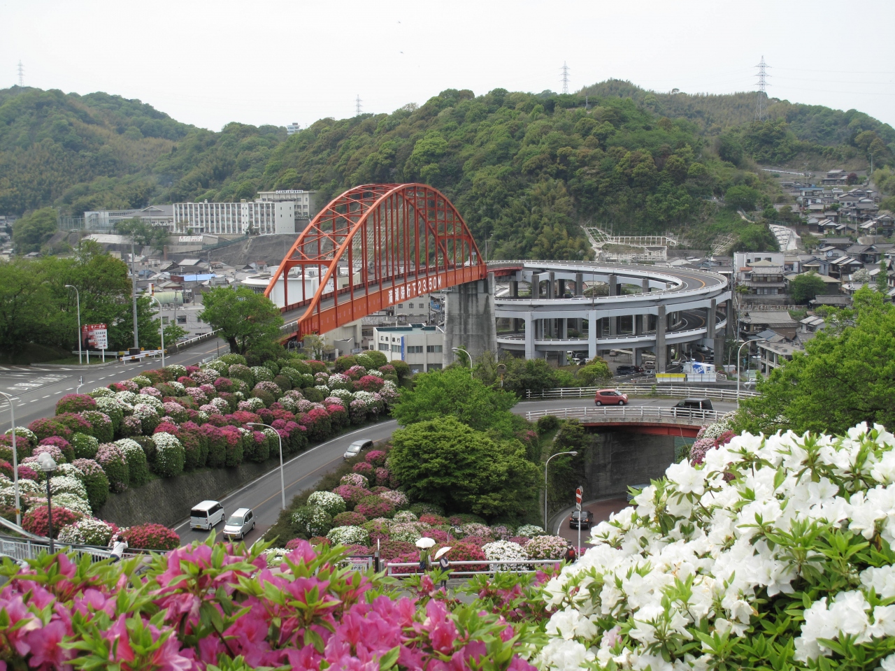 5月初旬、ループで有名な音戸大橋は、一面のつつじの花に包まれます。