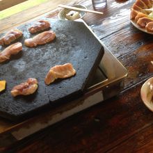 岩盤の上で焼いて食べる地鶏は美味しいです。