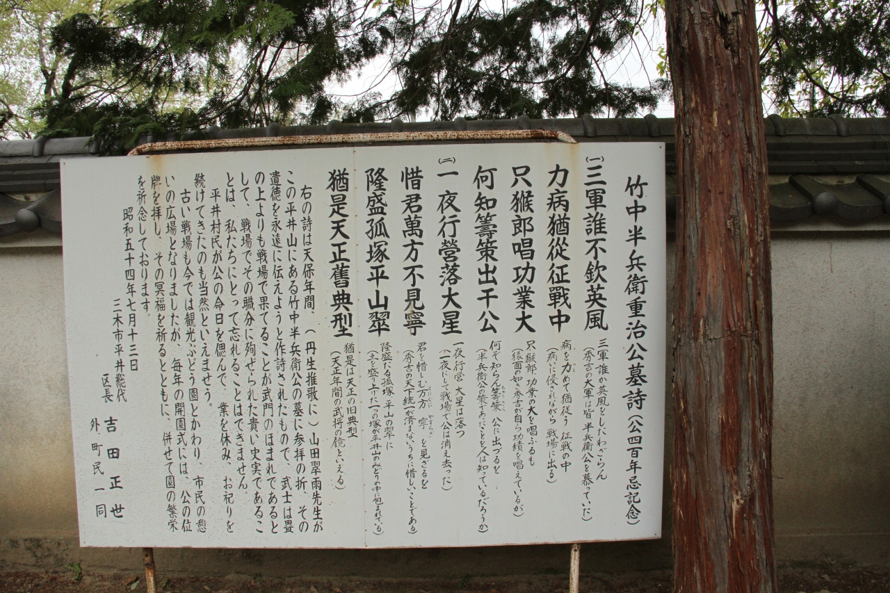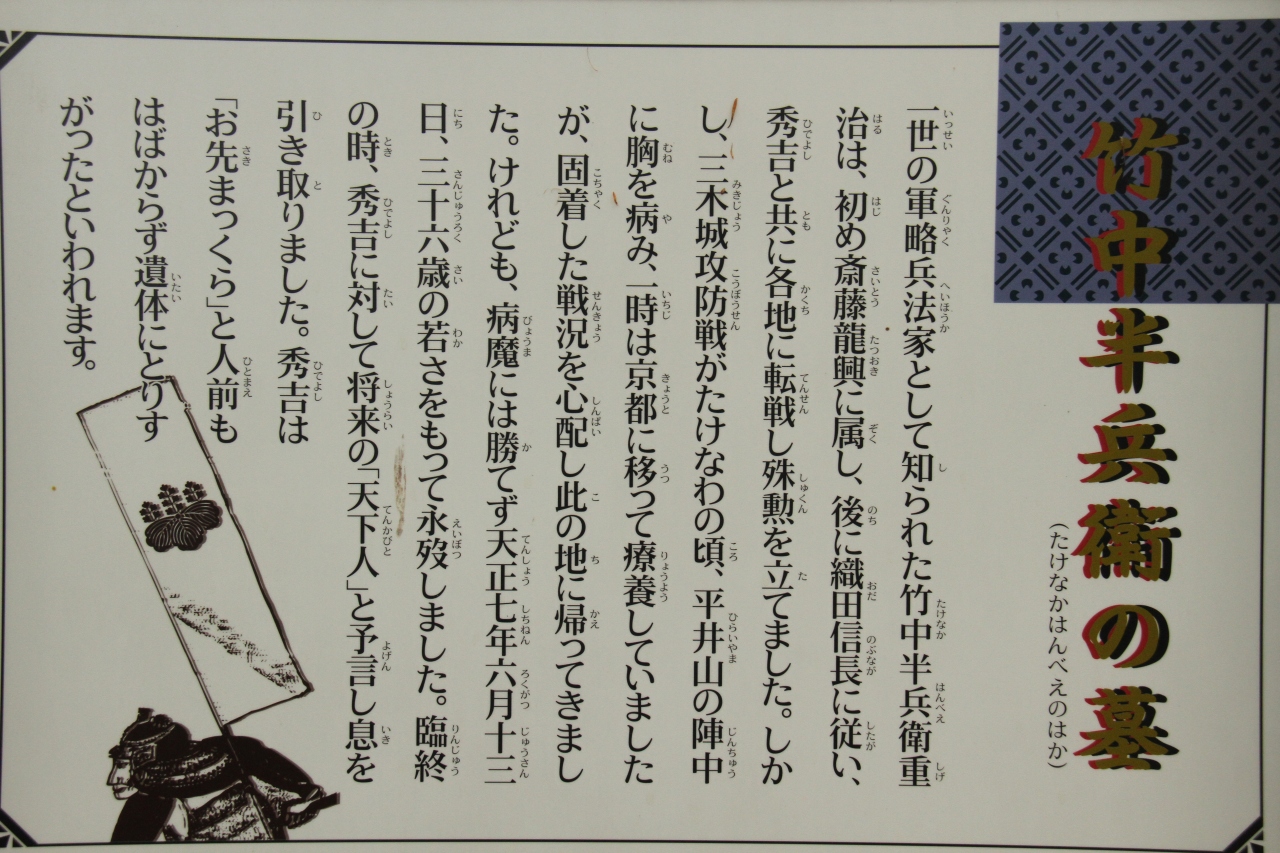 三木市内を走っていたら偶然見つけた「竹中半兵衛の墓」。