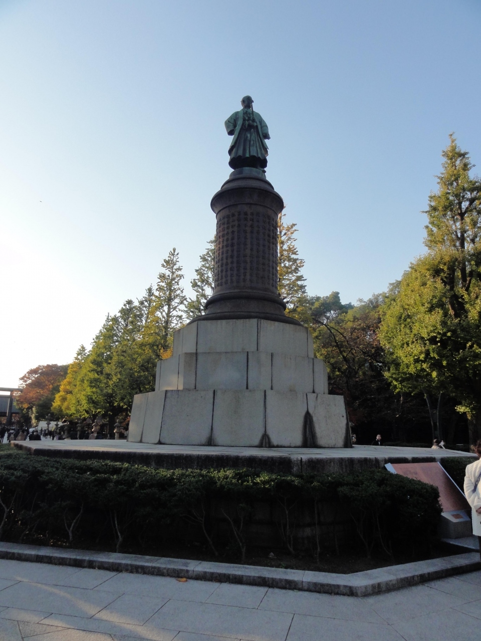 大村益次郎は靖国神社の創建に尽力して、明治26年に日本初の西洋式銅像として靖国神社の参道中央に建立されました。銅像の顔は上野公園の方を向いており、西郷隆盛像と視線を合わせているそうです。参道の真ん中から参拝客を見守っているように感じます。