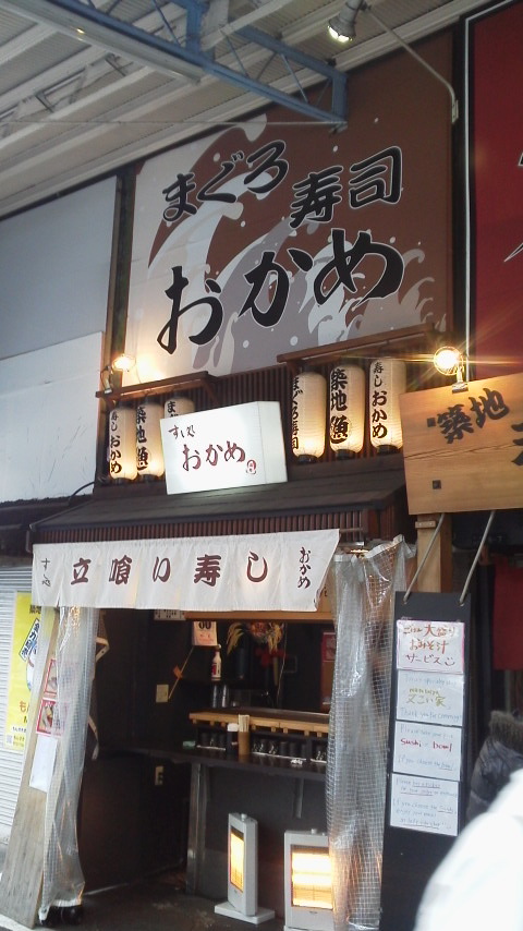 今や東京での定番の観光スポットになっている築地市場外のエリアにあるお店がここ「すし処 立ち喰い寿し おかめ」。築地エリアには、多くの寿司屋や海鮮どんぶりもののお店が多いですが、ここは立ち食いでお寿司がいただける、割とこじんまりとしたお店です。ここの看板のかいてある”まぐろ寿司”っていうのにひかれてはいってみました。まぐろ好きにはたまらないフレーズであり、築地というロケーションですね。築地を頻繁に訪れていろんな味を堪能するのもいいですね。