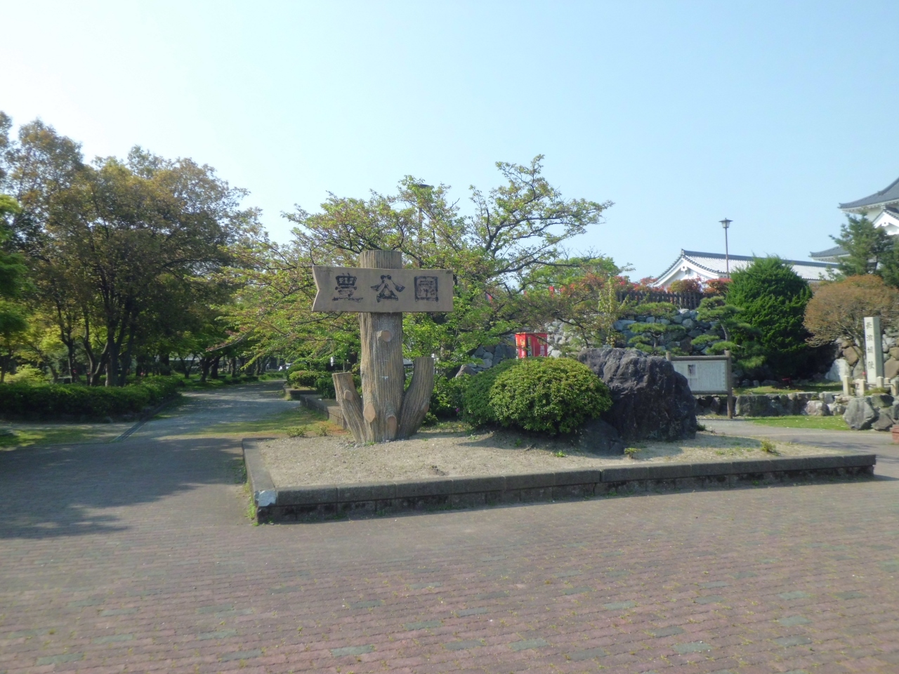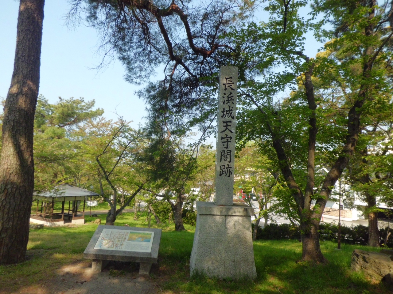 長浜駅から徒歩10分程度、長浜城(歴史資料館)が目印になります。琵琶湖畔の公園で、園内には秀吉の銅像や太閤井戸の跡など秀吉にちなんだものがいろいろあります。(豊臣秀吉にちなんで豊公園と名付けられたそうです)。城の周りには桜が植えらているので、シーズンはきれいでしょう(日本さくら名所100選に選ばれています)。