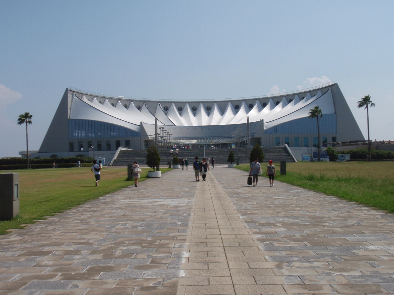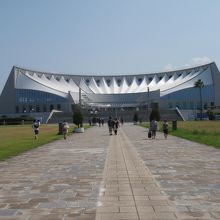 公園の中に建てられた、緑の中にたたずむ巨大水族館です。