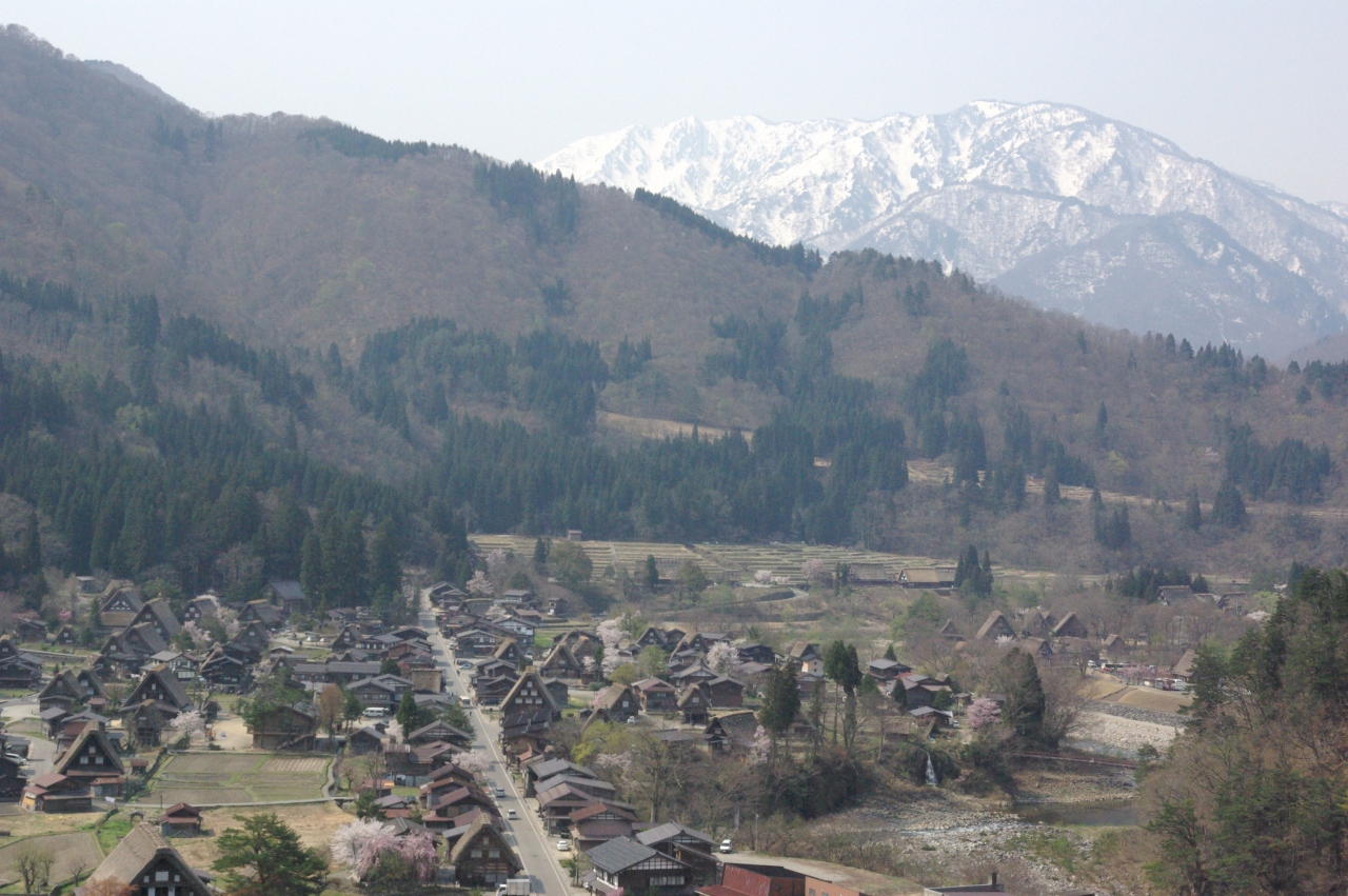 日本昔話に出てくる風景そのもので感動です。最初に展望台から村を一望して行きました。世界遺産に登録されたためか外国人がいっぱいでした。冬の雪景色が有名ですが、4月下旬でも桜が満開で、すばらしく良かったです。