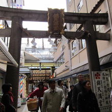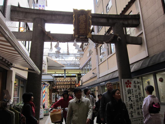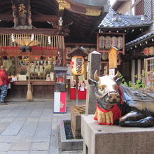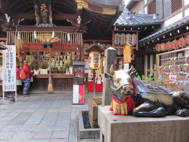 錦市場をぶらぶらと散策した後は、錦天満宮を参拝しましょう。小さな境内にはしっかりと牛さんもいます。近くには有名靴チェーン店があり少し興ざめですが、小さな境内に足を踏み入れると不思議と落ち着いた気分になります。