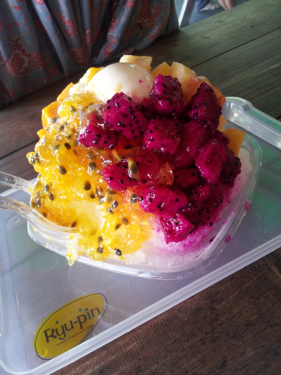 外には食事ができる店もあり、ドラゴンフルーツやマンゴーなどのフルーツの乗ったかき氷がオススメです。