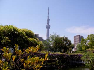 船橋屋で元祖葛もちを買って、亀戸天神の参道に入ると藤まつりに向かう人で混雑しています。鳥居をくぐって心字池にかかる男橋を渡るとスカイツリーが見えていて、参道の両側に藤棚がありちょうど見頃です。平橋の先の女橋の先が拝殿で、近くには撫牛がありました。