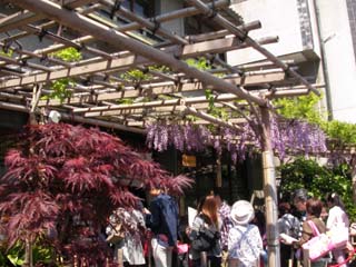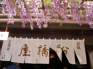 オリナスから横十間川に架かる天神橋を渡ると、元祖くず餅の船橋屋の本店があり、藤まつりに合わせて大勢の人出で行列が出来ています。お土産用のくず餅を買う列は短く元祖くず餅大箱(1,030円)をすぐに買えました。