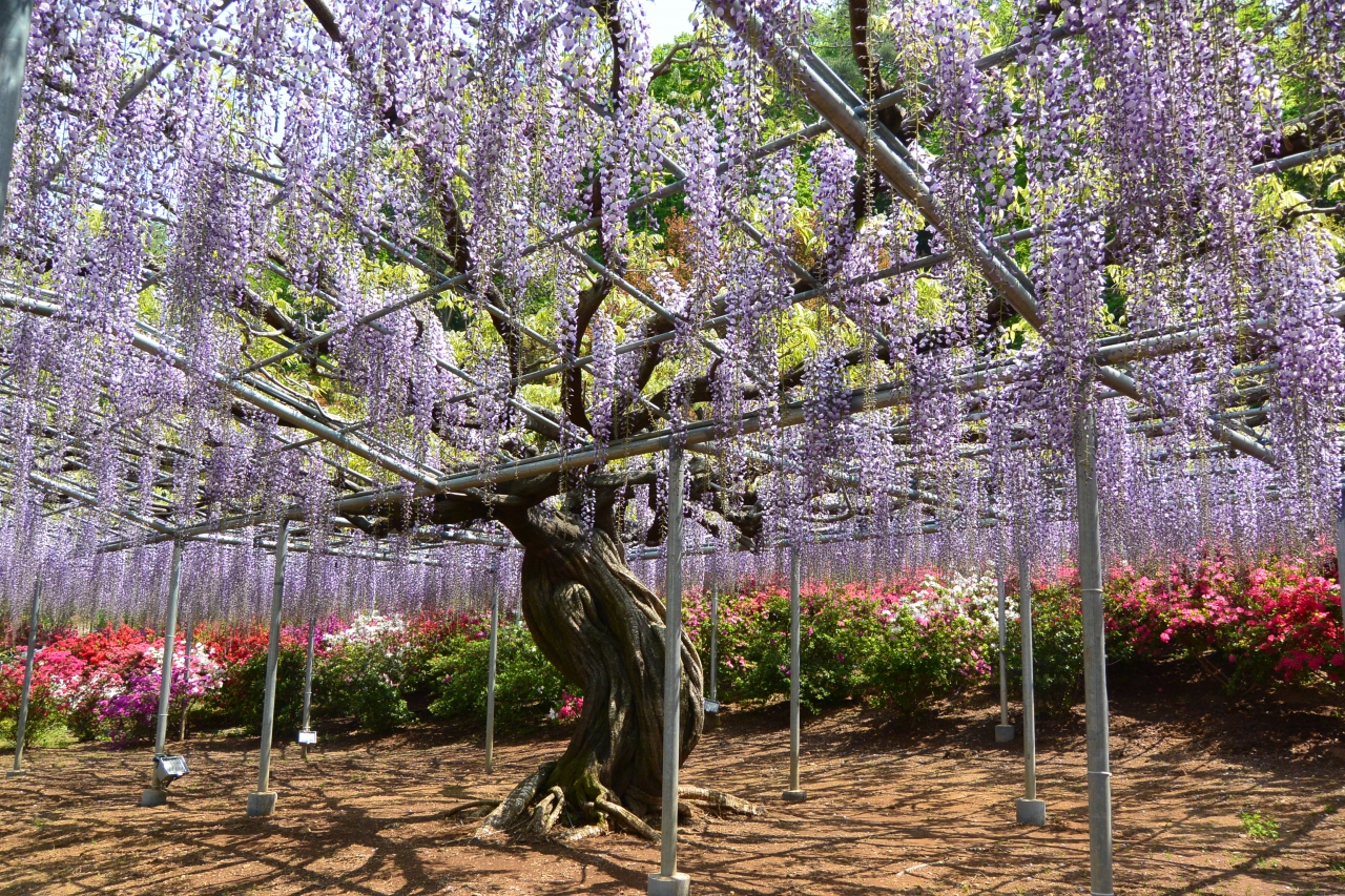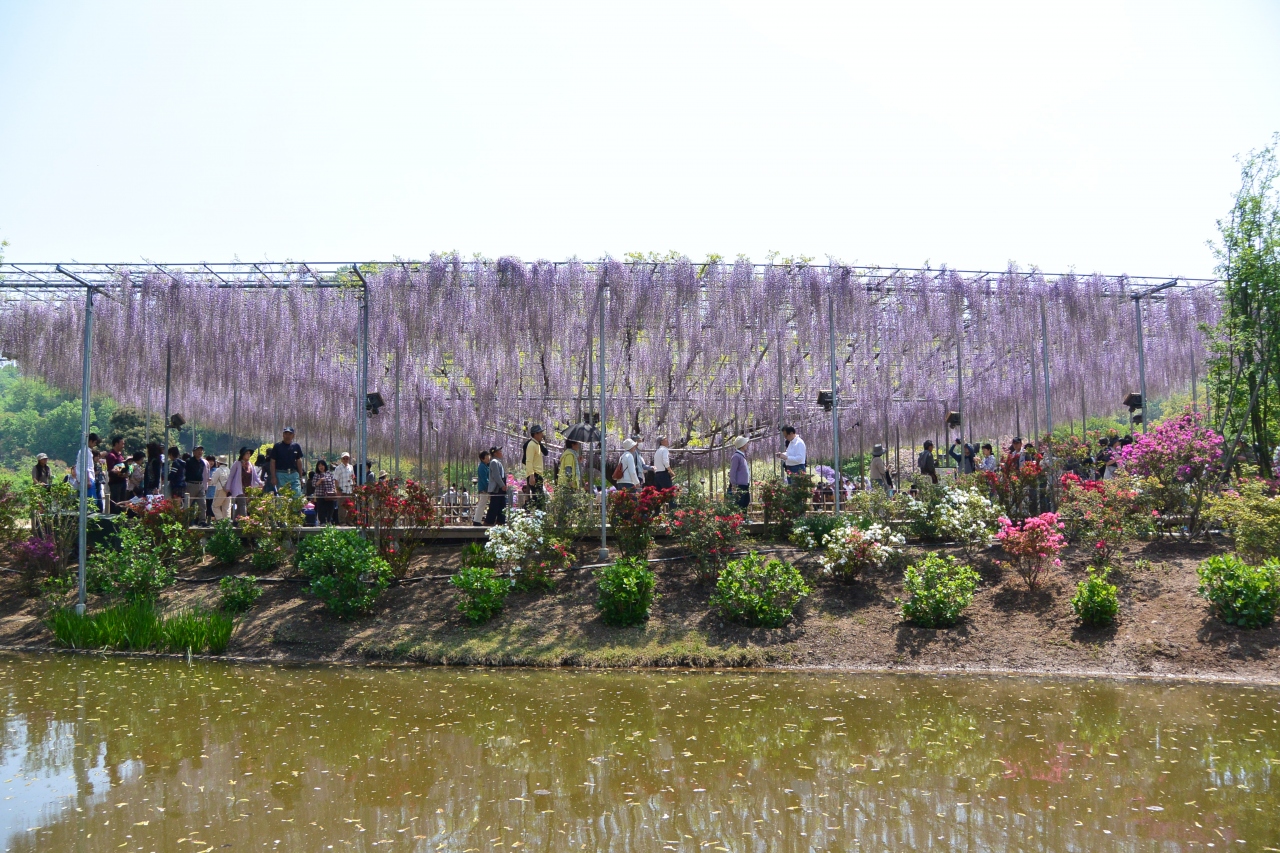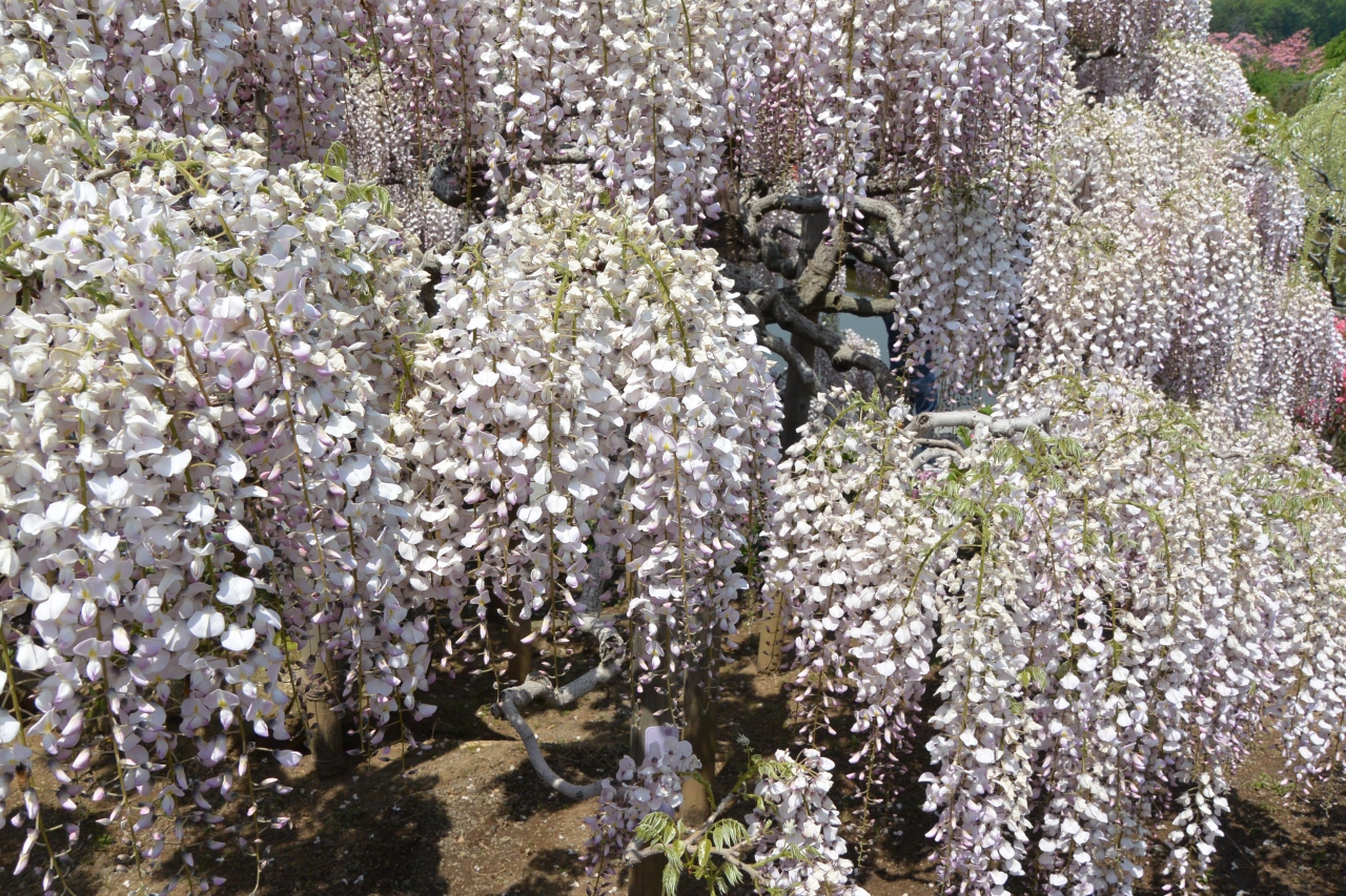 大藤、八重藤、大長藤などの開花は、70~8%咲きでしたが、白藤のトンネルはまだ咲き始めたばかりで満開にはまだまだでした。きばな藤のトンネルもまだでした。