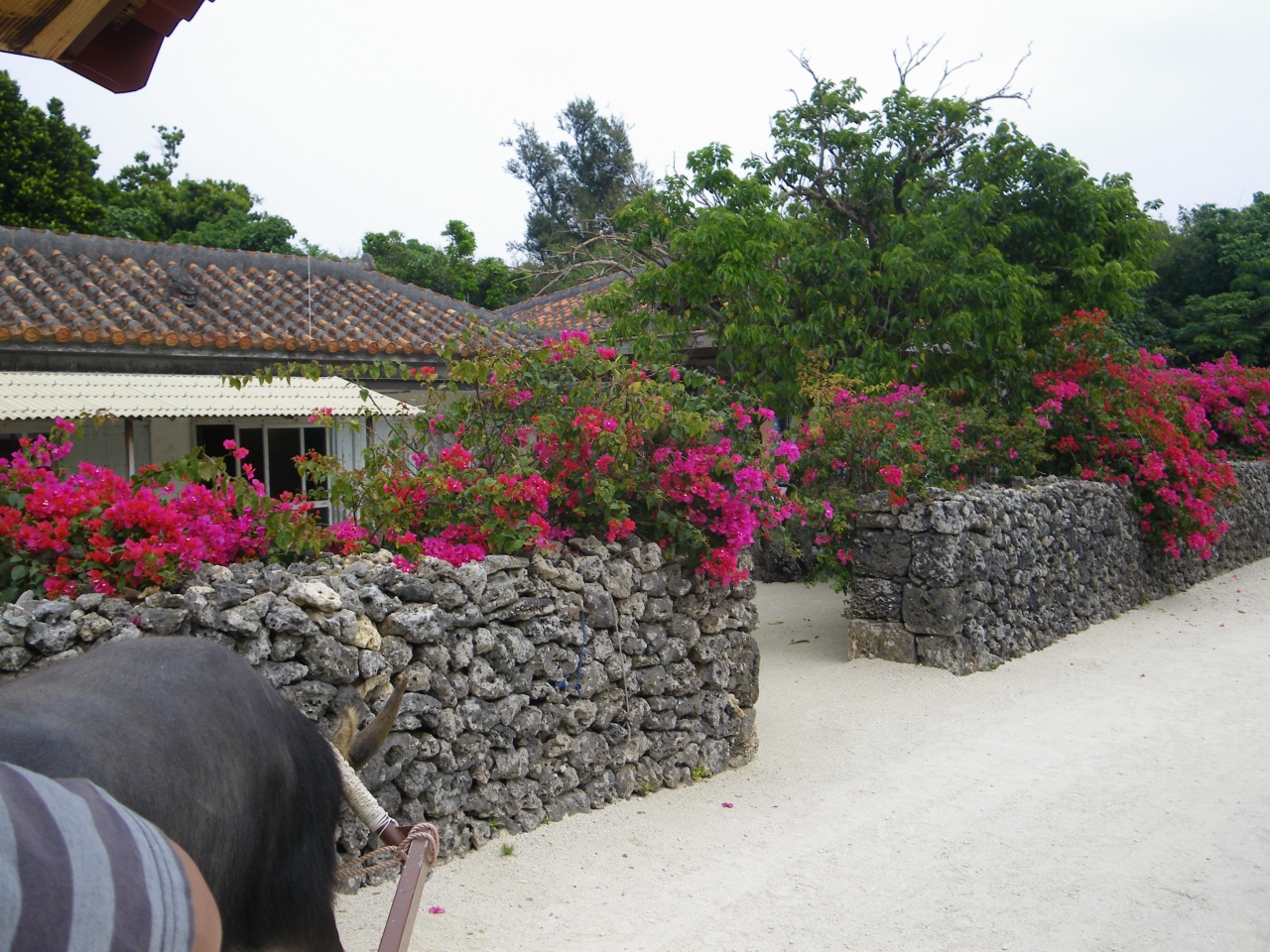 整備された白砂の路と、赤瓦の家、お庭にはブーゲンビリアやその他の花が咲き誇っていてとても綺麗でしかも懐かしい感じの街並みでした。