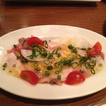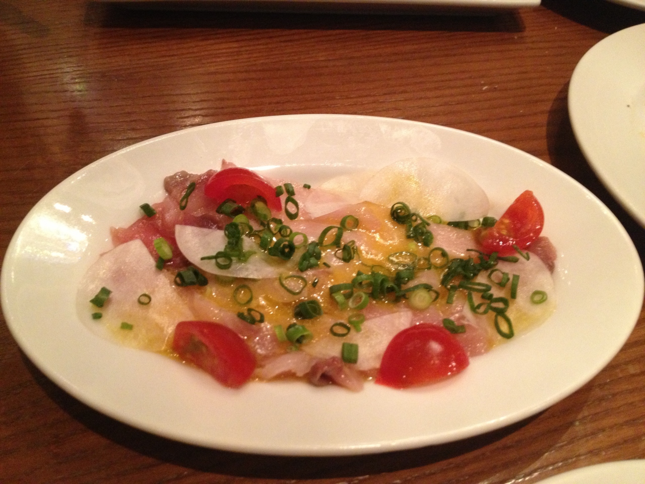 週末の金曜日、予約が取れず、18時から並びました。待っている間にバーカウンターで軽く飲めるので待っているという感覚が薄い。料理は「TAPAS ALL500」に20種類以上あり、どれでも500円で注文できる。その中でも「Carpaccio Yellowtail and Turnip」、「SHONAI Pork Sausage」。